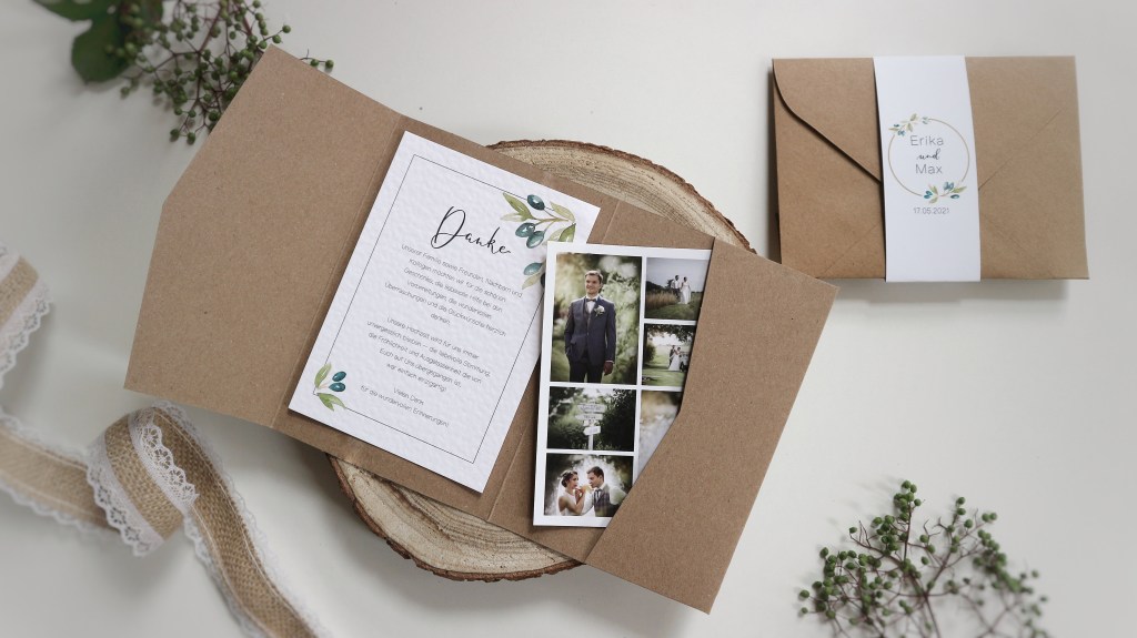 Diese Pocketfold Dankeskarte ist das perfekte Pendant zu eurer Einladungskarte. Die Cardstockkarte bietet Platz um euch bei den Gästen zu bedanken.