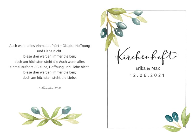 In dem Cover des Kirchenheftes spiegelt sich euer Design wieder, dass die Gäste bereits von der Einladungskarte kennen. Auf der Rückseite könnt ihr ggf. euren Trauspruch platzieren.