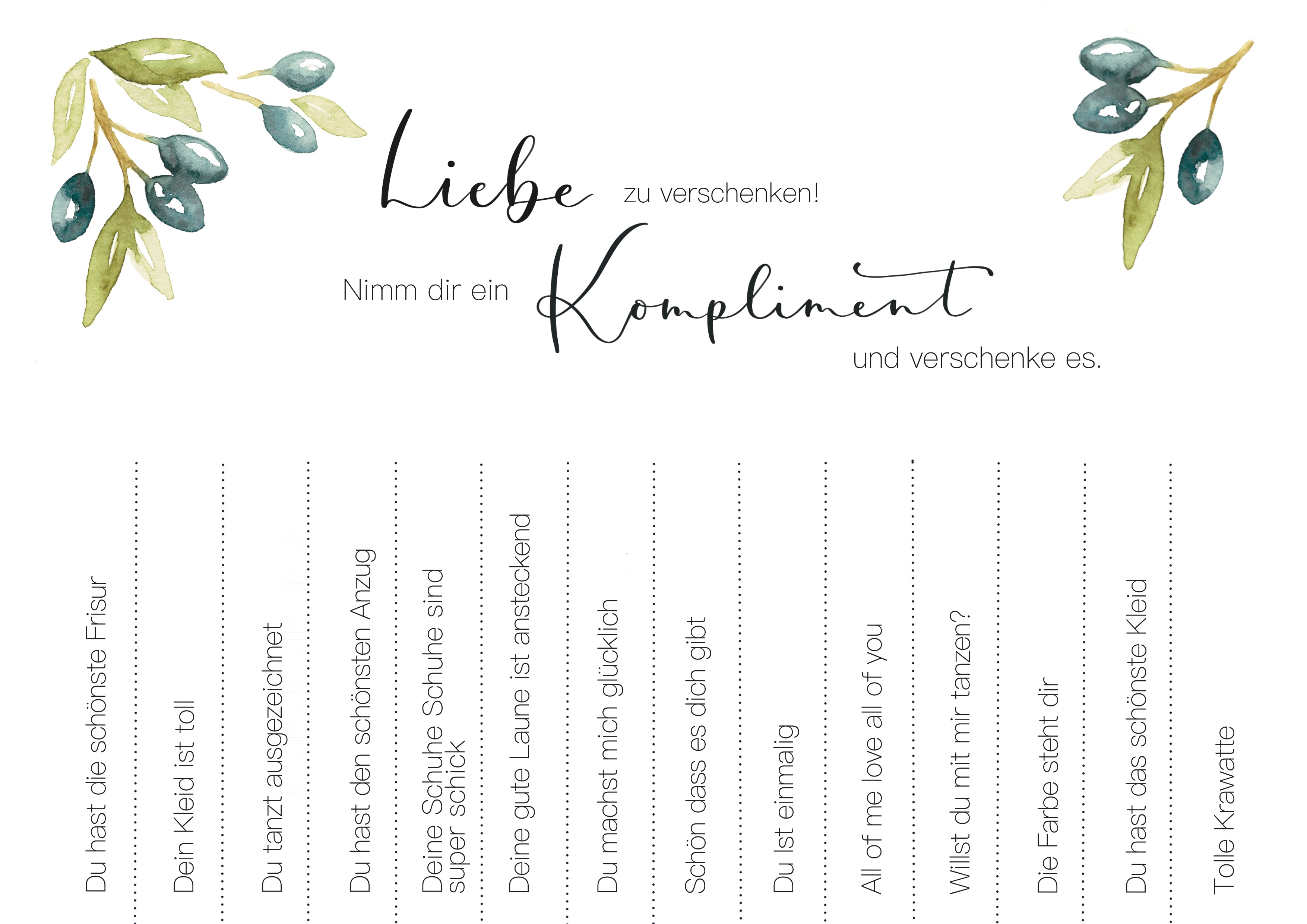 Diese soll natürlich auch auf eure Gäste übergehen. Gebt ihnen die Möglichkeit, Komplimente zu verschenken. Es wird garantiert für viel Freude sorgen.