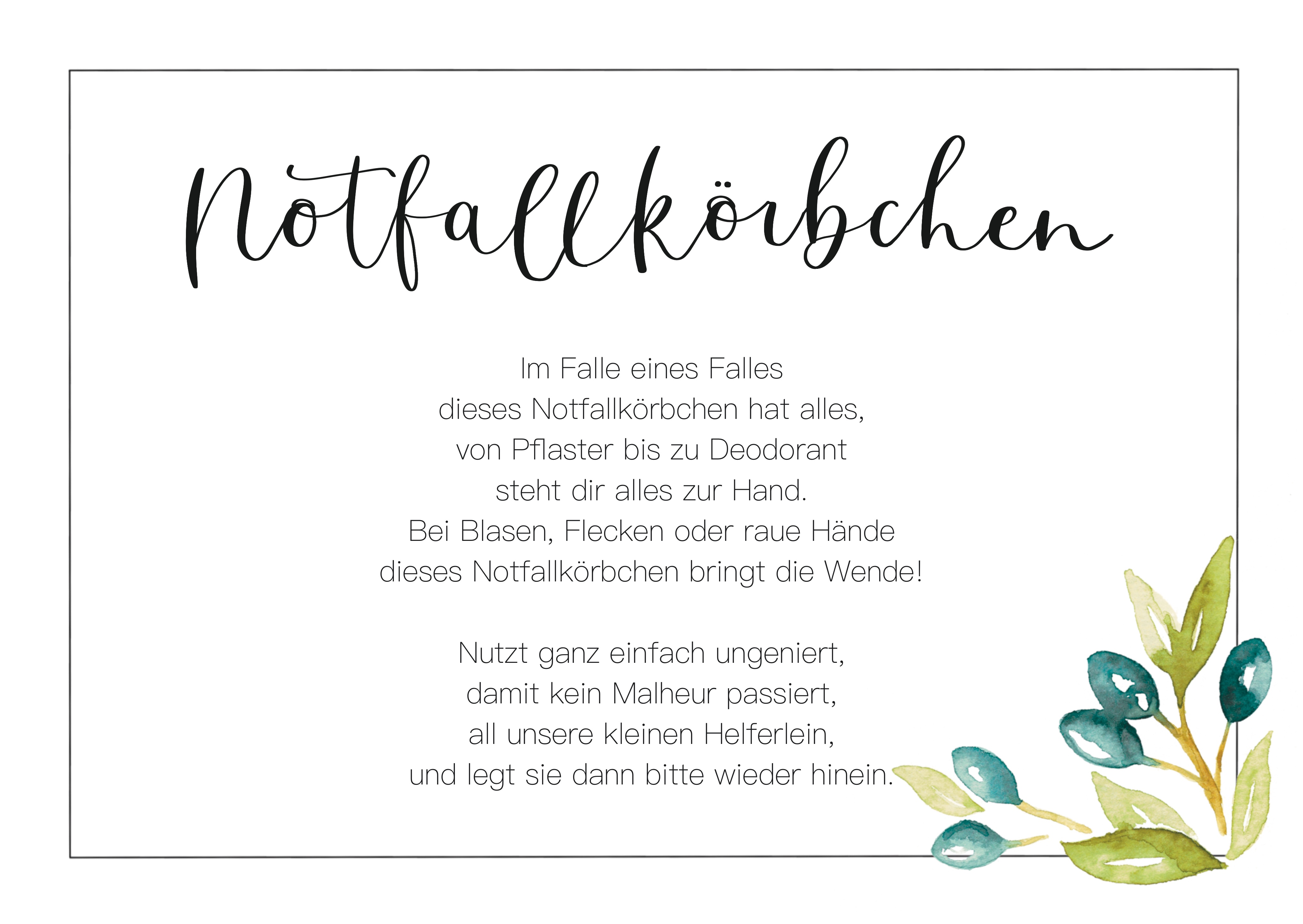 Rauschende Hochzeitsfeste dauern oft den ganzen Tag. Da bekommt der Ein` oder Andere schon mal Schweißausbrüche vom Tanzen, zerzauste Haare oder gar Blasen an den Füßen. Kleine Notfälle sind bei guten Partys vorprogrammiert! Aber kein Problem – denn mit dem Notfallkörbchen im Toilettenraum sind eure Gäste bestens versorgt und können sich ungeniert frisch machen. Sie werden es mit einem Schmunzeln, dankenswert annehmen.