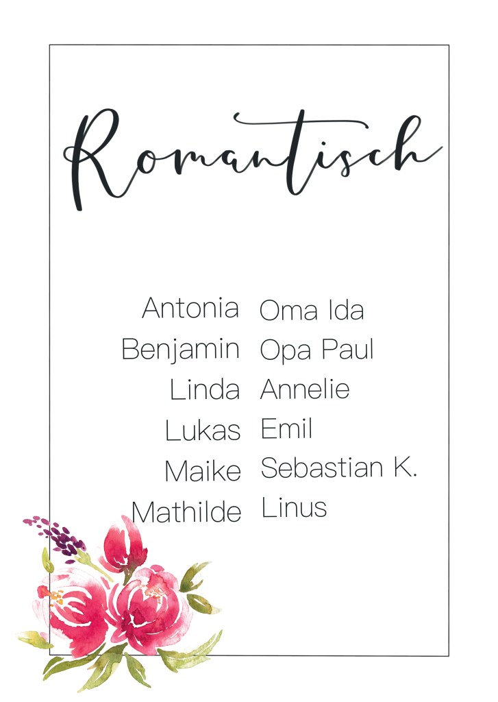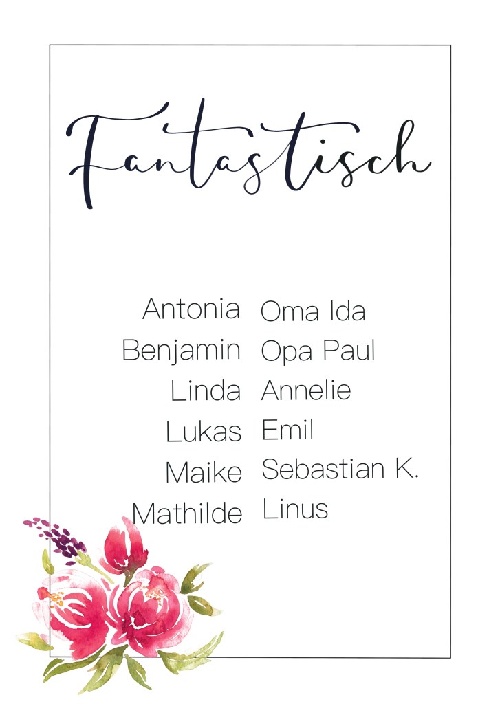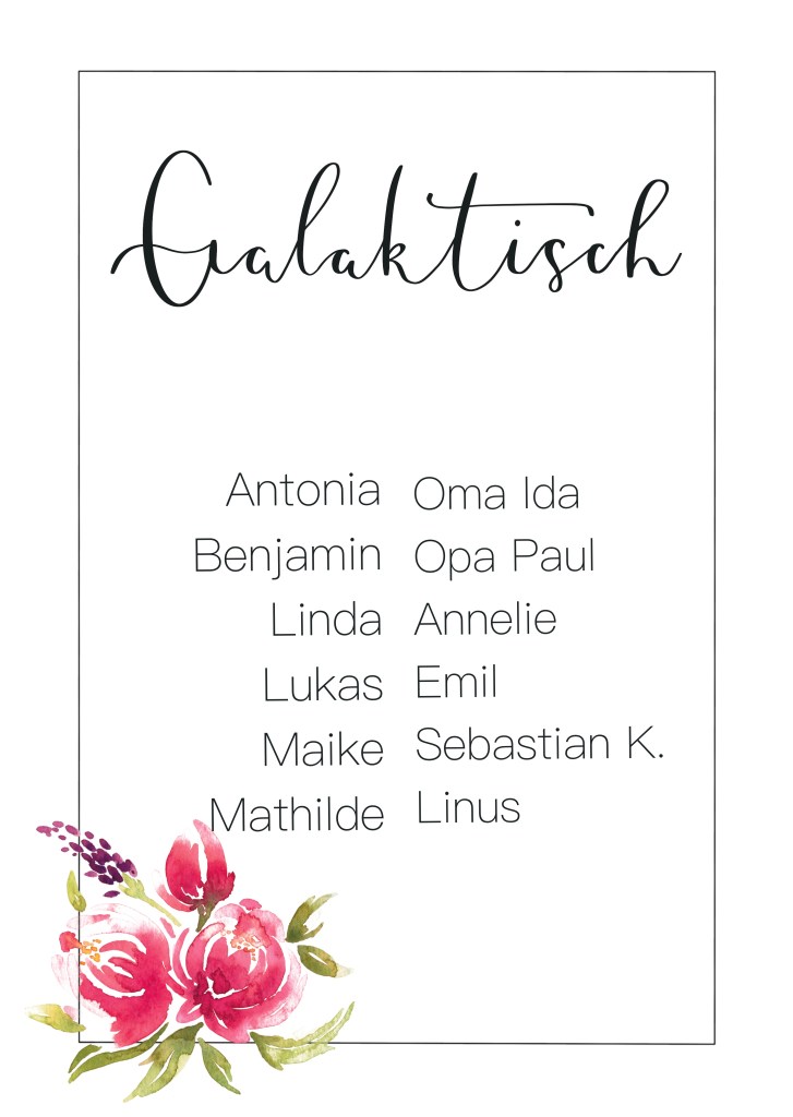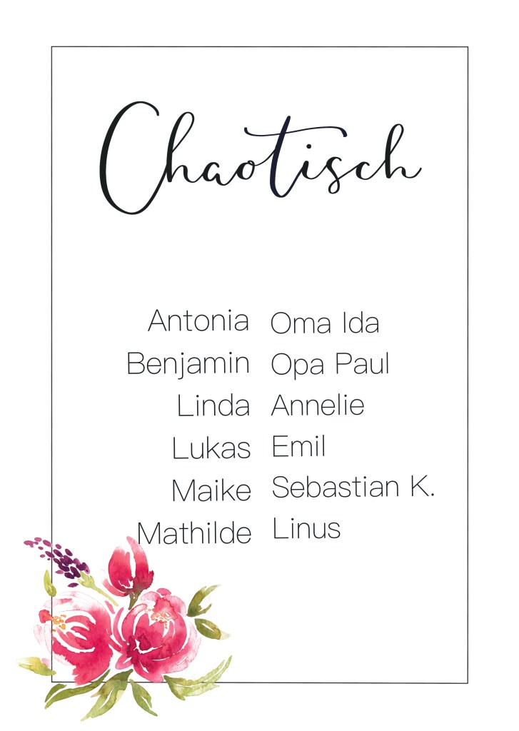 Oder: Um das große Durcheinander bei der Platzsuche zu vermeiden – platziert eine Zweitausfertigung der Tischpläne bereits im Vorfeld gut sichtbar ( z.B. beim Sektempfang o.ä. ). Die Gäste können sich dann in Ruhe vorab informieren. Wenn ihr diese Option für euch haben wollt, bedenkt bitte unbedingt zwei Ausfertigungen zu bestellen.