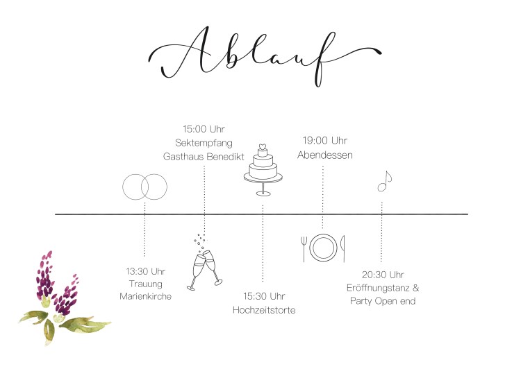 Zudem enthält die Karte zwei Einleger. Auf der größeren der Beiden (Einleger 1) sind der Ablauf (Vorderseite) und die genauen Adressen der Hochzeitsfeierlichkeiten (Rückseite) notiert.