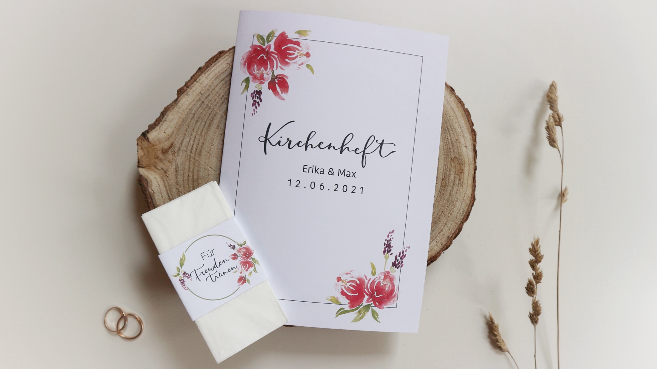 In dem Cover des Kirchenheftes spiegelt sich euer Design wieder, das eure Gäste bereits von der Einladungskarte kennen. Auf der Rückseite könnt ihr ggf. euren Trauspruch platzieren.