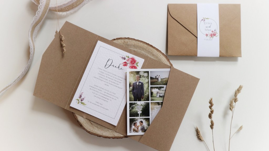 Diese Pocketfold Dankeskarte ist das perfekte Pendant zu eurer Einladungskarte. Die Cardstockkarte bietet Platz um euch bei euren Gästen zu bedanken.