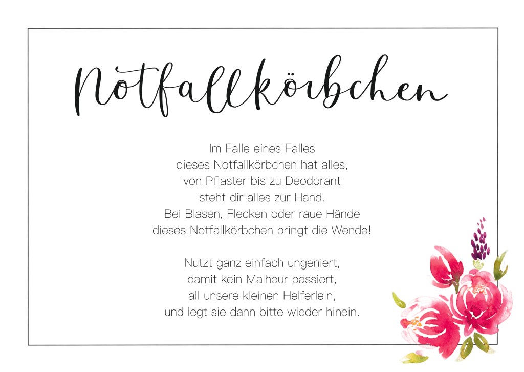 Rauschende Hochzeitsfeste dauern oft den ganzen Tag. Da bekommt der Ein’ oder Andere schon mal Schweißausbrüche vom Tanzen, zerzauste Haare oder gar Blasen an den Füßen. Kleine Notfälle sind bei guten Partys vorprogrammiert! Aber kein Problem – denn mit dem Notfallkörbchen im Toilettenraum sind eure Gäste bestens versorgt und können sich ungeniert frisch machen. Sie werden es mit einem Schmunzeln dankenswert annehmen.